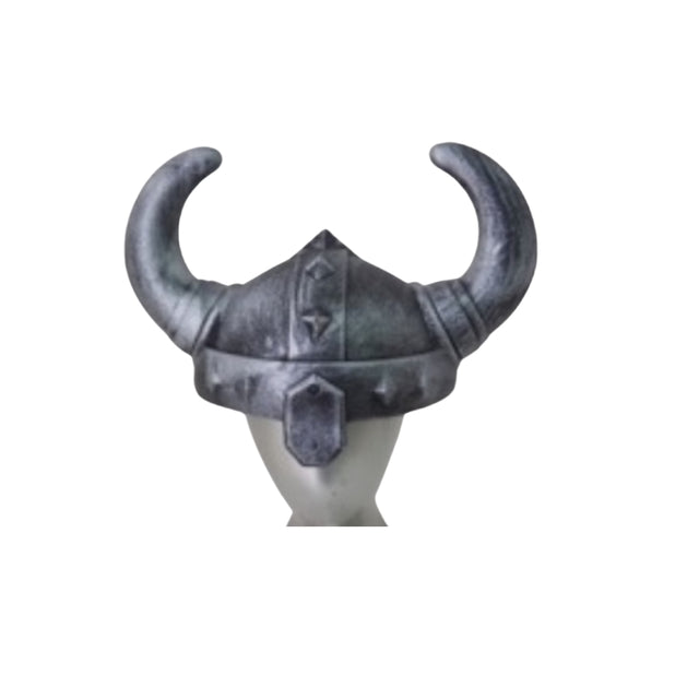 Ready to go a viking?  Let us help you get your Viking costume ready with this awesome  hard plastic helmet.  Helmet is painted with silver and black to give it a worn and distressed look.  Norseman helmet has two detachable horns and a row of triangle spikes on the top of the helmet.  Helmet has a plastic nose guard.  Perfect for a viking cosplay, costume or LARP outfit.  Helmet is lightweight and large enough to fit the biggest, brawniest Norseman.  Helmet is one sized fits most.