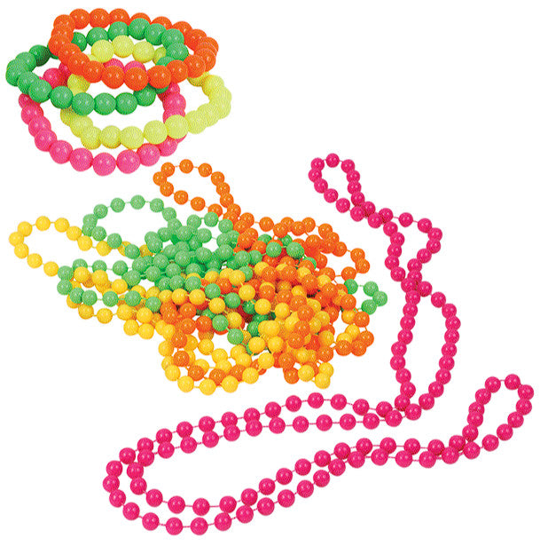 In the '80's we wore a lot of jewelry, I mean a lot!! Multiple bracelets on each wrist and lots of necklaces! We were too cool! So if you are choosing to do an '80's look, you are going to need lots of jewelry too. In this set you get 4 bracelets and 4 necklaces. You get one each of pink, green, orange and yellow neon beaded bracelets and necklaces. Mix and Match with friends or wear all of it at once, like Madonna or Cindi! Bracelets are on a stretchy cord so they are one sized fits most. Buy multiple bags and share with your friends. Glows under blacklight.