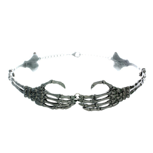 Release your inner dark side with our Skeletal Hands Choker. Made of silver metal, these skeleton hands and arms delicately wrap around your throat. The choker comes with an extension chain and lobster claw clasp for a perfect fit. Perfect for Halloween, goth style, or punk looks. One size fits most.