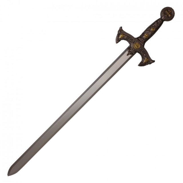 Invade a foreign country and wage war! Just kidding, that is not a very nice way to treat your fellow humans. It's much more fun and friendly to LARP! This sword is made from sturdy mixture of polyurethane Foam with a PVC core. Handle is made from a gunmetal colored polyurethane foam with gold Templar Knight symbols. Handle and guard are very detailed with scrollwork. Visible blade is 34" inches and the handle and guard are 12 inches overall. Sword has a disc pommel on the handle and is very lightweight and flexible.