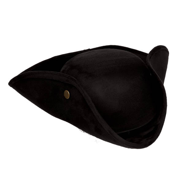 Fight the revolutionary war or sign the declaration of independence in this awesome traditional tri corner hat. Faux suede hat has snaps on each flap so you can wear it snapped or loose. Made from a soft faux black suede. One size fits most. Great colonial hat, revolutionary hat or historical hat. Good for school, theaters and parties!