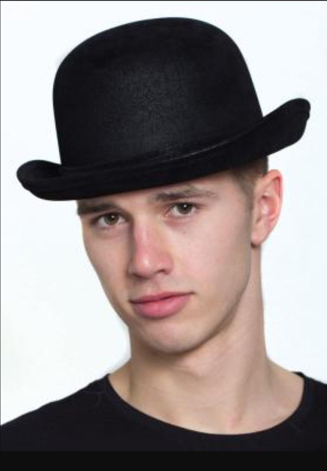 A classic hat never goes out of style! This beautiful bowler is made from a leatherlike black material. Hat looks and feels like real suede leather. This jaunty bowler has a black elastic adjustor inside the brim. Perfect for a Victorian gentleman, steampunk guy or just to add a vintage look to your outfit! One size fits most.
