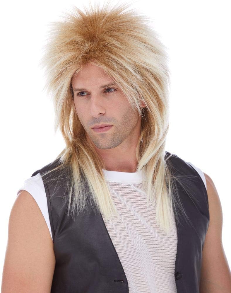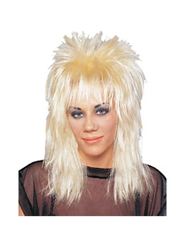If you want to be a 80's hair rocker or the Goblin King we got a great wig for you. This amazing wig has lots of great layers from a spiky top to long straight back. This unisex wig can be worn by both men and women. Use the mixed blonde for Jareth, the black for a Joan Jett look and the blonde for a hair rocker. This wig is similar to a mullet, but much fuller and taller. Wig has an elastic back and is a one size fits most. Available in blonde, black and mixed blonde.