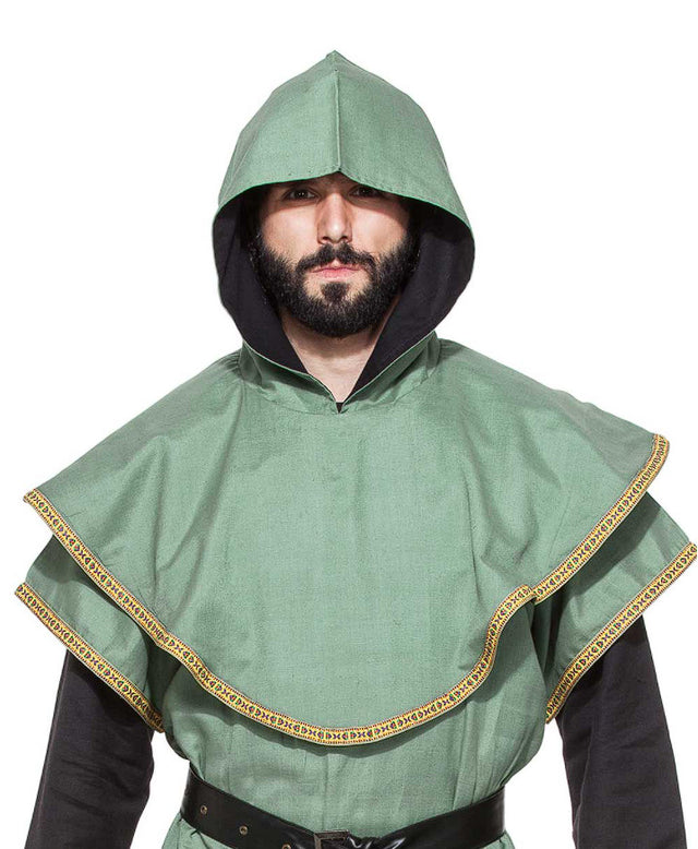 Even medieval peasants liked to be warm and stylish. This green linen hood is perfect for your next renaissance faire or SCA event. Made from a soft linen and lined with 100% black cotton. Hood is attached to a wide mantel that falls to mid chest and past the shoulders. Gold embroidered trim lends an element of regality to its look. Whether you are looking for a practical head covering to help protect yourself from the elements or a fashionable addition to your LARP fantasy themed ensemble, this linen hooded mantle can help you accomplish both. Wear it with the Medieval Huntsman Tunic sold separately. One size fits most adults.