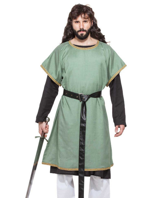 Prove your worth when you embark on your next adventure wearing the Medieval Huntsman Tunic. Made of light but sturdy linen, this light green reenactment tunic features roomy elbow sleeves and a slightly flared length for easy mobility and style. Ending near the knees on most wearers, this staple reenactment garment is based on historical styles, featuring a scoop neckline and colorful golden embroidery trimming its hems. Great for wearing during warmer months or layering over a long sleeve underdress, as shown here, this versatile tunic works well for a variety of characters, from rugged woodsmen to wealthy nobility. Accentuate with your favorite leather belt, not included, and you will be ready to run off to your next reenactment adventure, Renaissance festival, or medieval themed LARP event.