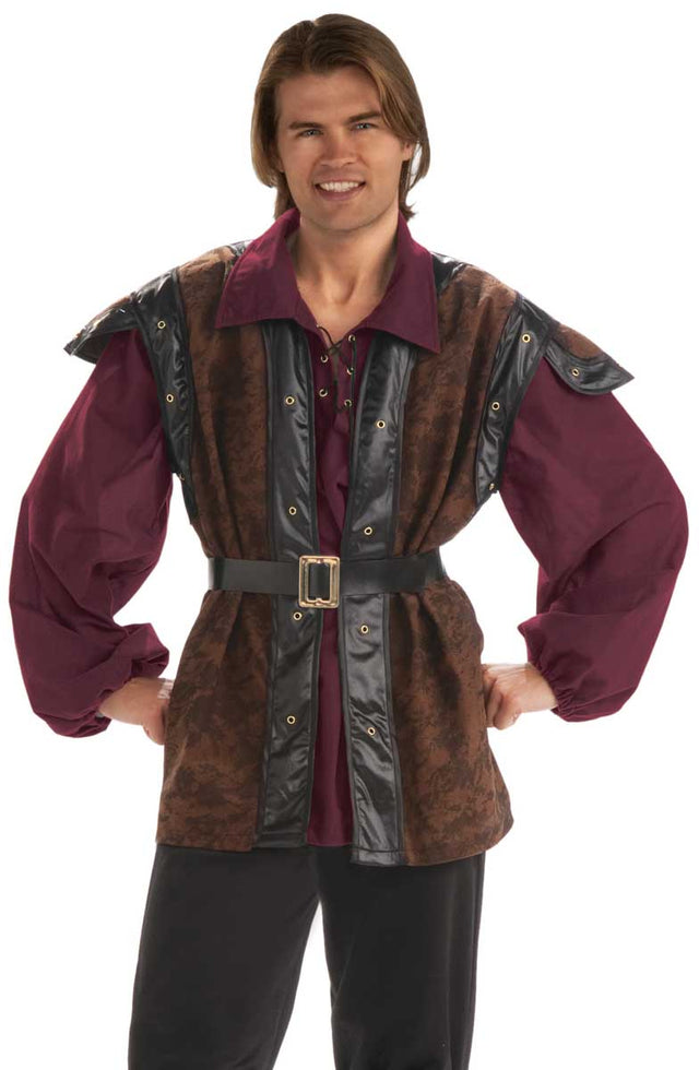 Love to sword fight, but don't want to swear fealty to some noble lord? Be a mercenary! Fight when and where you want! So you need to dress the part. This costume includes a maroon shirt, faux leather vest and belt. One size fits most men who have a 42 inch chest. Pair it with some black pants. Perfect for a renaissance faire, pirate day or cosplay.