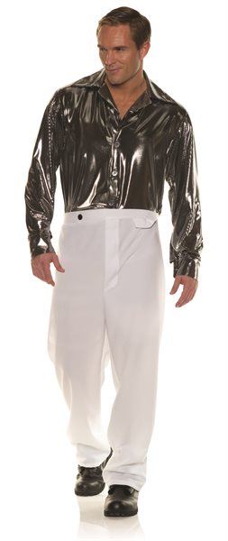 Light up the disco dance floor when you choose any of these amazing shirts! Choose from Gold or Blue foil tiger striped or gold or black iridescent shirts. Shirts are long sleeved and button up the front and button on the cuff. Pair them with a gold chain and some bellbottom disco pants. Standard (OS) fits chest size 42-46 inches, 2XL fits chest size 50-52.