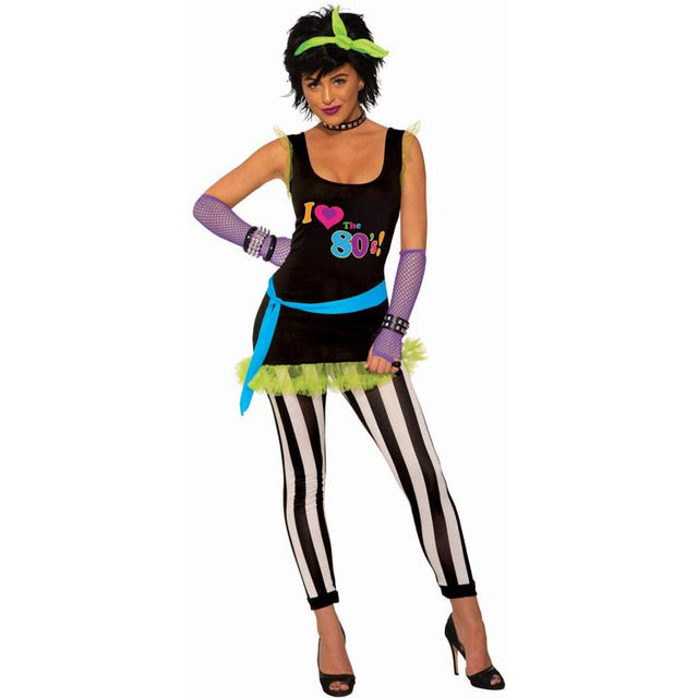 Totally Tubular dudette! Slip into the wild fashions of the 1980's with this amazing and colorful costume. Totally reminiscent of the neon 80's, this costume features a long black tank top dress with "I love the 80's" on the front. Dress has green tulle ruffled trim on the sleeves and a green ruffled tulle hem. Costume has stretchy black and white footless tights. Outfit includes a bright blue fabric belt and neon green fabric headband. Fingerless fishnet purple gloves complete the costume. Jewelry and heels not included. One size fits most from size 6-12.