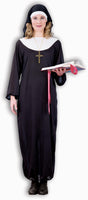 Nun for you, nun for you and nun for you! If you want nun in your life, we have what you need. Whether you are doing a naughty nun or a traditional nun, this classic nun costume will help you accomplish your goal. This two piece costume features a long black robe with attached white collar. Robe has a hook and loop for closure in the back. The headpiece resembles a habit and ties in the back, behind your hair. Pair it with some sexy fishnet for a naughty nun or gold plastic cross for a classic nun sold separately. One size fits most, up to size 14/16.