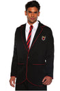 Show off your school pride and look magnificent doing it in this Anime Academy Jacket. This cosplay academy jacket is black with red trim around the edges and an attached embroidery patch. Jacket has faux pockets on the front. Costume includes a white shirt front and red and black striped tie. Pair it with some black pants to complete your look. Available in One Size or 2XL.