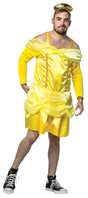 Be our guest! Be our guest! Live in the castle and charm the beast (and all the other party people) when you wear this manly princess costume. This awesome men's costume features a bright yellow off the shoulder dress with straps and a gold fabric foam crown on a headband. You will be the "Belle" of the ball in this lovely yellow costume. One size fits most (42-44 inch chest).