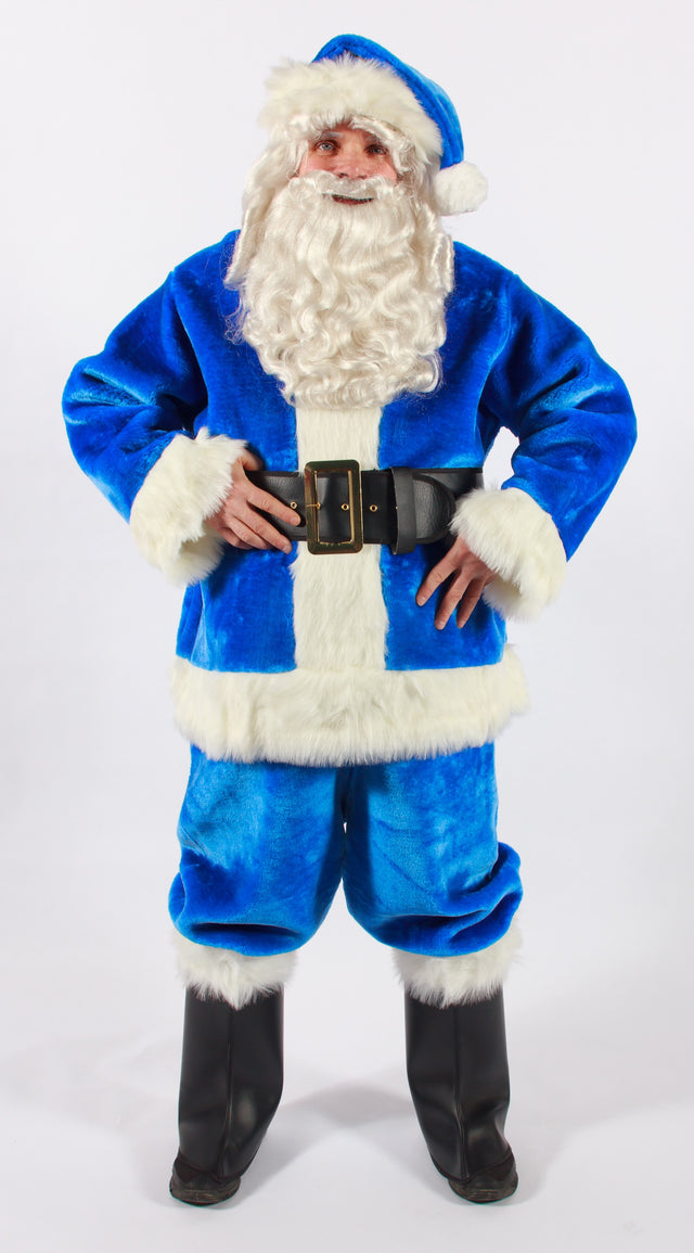 Blue Plush Santa Suit. Made of blue pile plush with white long-hair trim.