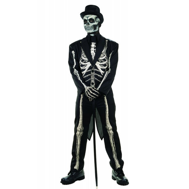 What's up Bone Daddy? Show off your skeletal elegance in this amazing Tuxedo suit. Suit is printed front and back with a skeleton. Costume includes a tuxedo jacket with tails, black pants and printed skeletal design. Also includes skeleton gloves, and faux white shirt front with attached shirt. Great for a skeleton costume, voodoo costume, gentleman skeleton costume or cosplay. Pair it with a cane and skeleton face paint to complete the look. One size fits up to a 42 inch chest, 2XL fits up to a 50-52 inch chest.