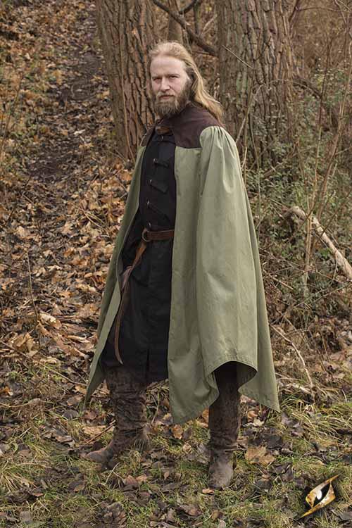 Not everyone who LARPs or goes to the renaissance fair wants to be a barbarian or Viking. Some go for a more noble look, with grace and style. So top off your look with this gorgeous cape. This lovely knee length cape has a high brown collar and green pleated fabric. Cape has an open front so your hands are free to pull a sword or eat a turkey leg. The Cape Edrahil is a powerful cut with longer sides. Secure the cape by overlapping the collar in front of the neck and tying its leather ties through the top leather patch. Available in dryad green/brown combo. One size fits most.