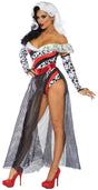 Don't let those lovely puppies escape you! You are in your villain era after all. Let them all know when you slide into this amazing Cruella costume. This bodysuit includes an off the shoulder bodysuit with snap crotch. Bodysuit has white and black faux fur around the shoulders and zips up the back. Attached skirt is made from sheer black material with black sequins and falls to the ankles. Costume also includes spotted arm covers and clear shoulder straps. Available in size Large.
