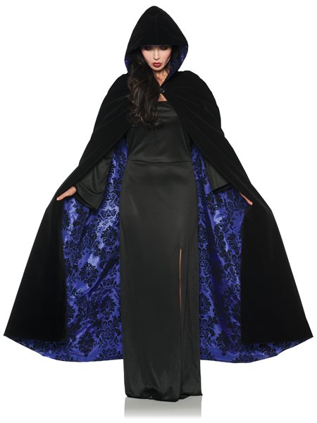 We love, love, love this beautiful cape! This deluxe cape is a rich heavy velvet on the outside and red, purple or grey satin for the lining. Cape has a full hood and button closure at the throat. The rich satin lining is velvet flocked in a Damask print. Capes are ankle length and are wonderful for a medieval or renaissance look. Perfect for vampires, kings, queens, proms, homecoming and more. One size fits most adults and teens. Choose from Black with red lining, black with purple lining or black with grey lining. Linings are flocked with velvet.