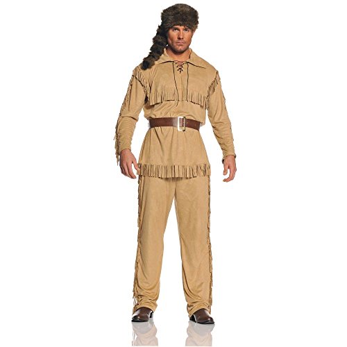 King of the Wild Frontier, that is what they will say when you rock up to the party wearing this awesome costume. Costume includes a shirt, pants and belt. Shirt and pants are made from faux suede and shirt laces in the front. Shirt and pants both feature fringe. Pants have an elastic waist band for a good fit. Costume has a faux leather belt with buckle. Pair it with a frontier hat and a rubber hunting knife to complete your look. One size fits most adults and teens up to a 44 inch chest.