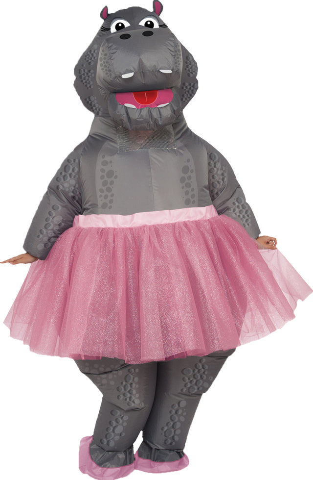 We know that hippos are adorable, yet vicious killers. Cartoon hippos? Not so much. This amazing hippo costume is guaranteed to make you the star of the costume party. This grey inflatable hippo costume is a beautiful ballerina. Costume comes with an attached pink tutu and pink ballet shoes. Costume has swirls and dots on the head, arms and legs. Costume has a view port under the head so you can dance your way through the party. Zips up the back for easy on and off. Costume includes a fan for inflation. Fan requires 4 "AA" batteries. One size fits most adults.