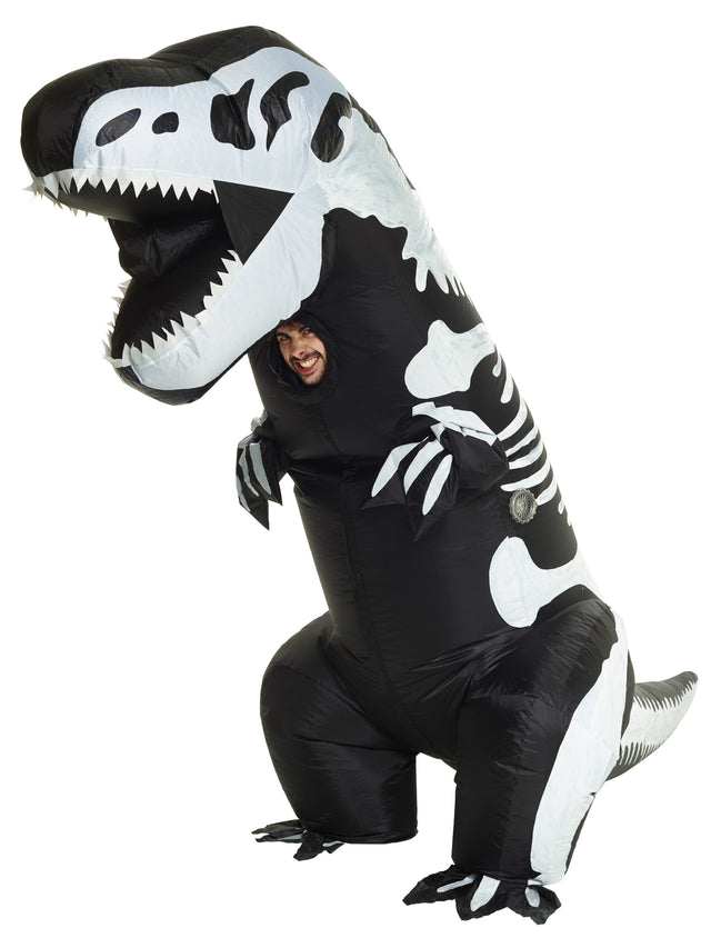 Everyone's favorite dinosaur is the T-Rex, especially the inflatable species! This classic dinosaur costume has a fun twist, it is actually a T-Rex skeleton! This black suit has a dinosaur skeleton printed on it. Costume has a hidden fan that inflates the suit around you. Turn on the battery powered fan and you'll soon be a towering Skeleton T-Rex. This dinosaur costume is great for both Halloween and parties. Costume also includes an elastic hole in the neck so you can look out. Requires 4 AA batteries, not included.