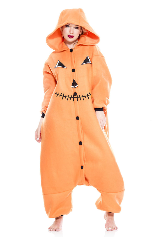 Want to be comfy and warm this Halloween? Tired of sexy nurses, cops or maids? Slip into this fun costume. This one piece bright orange jumpsuit will keep you warm on a cold fall night. Jumpsuit has a hood and snaps up the front. Jumpsuit has a traditional jack o' lantern face on the front. These Kigurumi are absolutely adorable! This Sweet Pumpkin is made from soft, plush material and has a hood. Costume crotch extends to the knees and are fitted around ankles and wrist. Costume snaps all the way up the front. These work great as a comfy, warm costume or pj's! One size fits most adults.