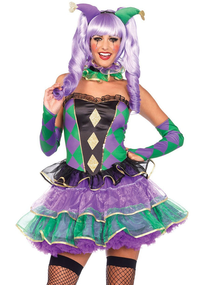Celebrate the holiday in sassy style. The Mardi Gras Sweetie is a awesome 5 piece costume. Included is a purple, green, black and gold one piece dress. Top features black ruffle trim around bodice and a black satin front insert. Insert has gold glitter diamonds sewed down front and gold sequin trim. Rest of bodice is green and purple diamond print. Skirt has 3 tulle layers in black, purple and green trimmed with gold ribbon. Skirt has a solid purple underskirt. Costume zips up the back. Outfit includes detachable clear shoulder straps, purple and green glovelets, green ruffle choker and green and purple horn headband. Stocking and shoes sold separately