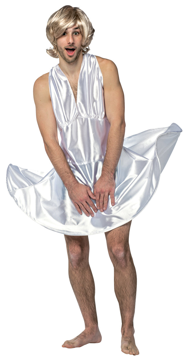Why should women get all the sexy costumes? Guys, here is your chance to show off your sexy gams with this fun Miss Manroe costume. Based off of Marilyn Monroes famous white dress, this costume is built to fit most guys. Front of dress has a deep v front and a wired skirt. Position the wire in the skirt to make it look like a strong breeze is blowing your skirt around your legs. Back of dress ties closed at the neck and has a ruched back so it fits. Pair it with our blonde Starlet wig and some white tennis shoes (or heels, we won't judge). One size fits most adults.