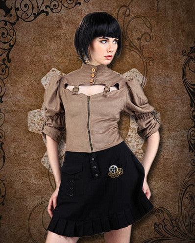 The Moire Tie-Back Blouse truly is a striking and singularly styled blouse that features an impressive and unique look. This blouse is a perfect complement to almost any Steampunk style, fitting perfectly into the eccentricity of the Steampunk genre. This blouse has a decidedly authoritative look and is made from soft brown suede fabric. The blouse features puffed shoulders and ruffled sleeves that are gathered just above the elbow. The blouse has 3 buttons at the neck, as well as 2 buckles that span a slit in the blouse just above the bust area. The feature for which this blouse is named is displayed prominently on the back, where a drawstring with eyelets is laced in a crisscross pattern. The interior of the blouse is lined with a black shantung fabric. If you are looking for a stylish Steampunk garment to include with your newest Steampunk costume or just want to add an interesting new garment to your wardrobe, then this Moire Tie-Back Blouse is definitely a garment to consider.
