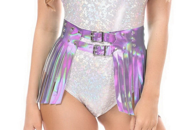 Stand our from the festival crowd with this unique and stylish fringe mini skirt. Made from a high quality material for long lasting wear. This pink holographic material shimmers under all light sources. The wide waist band ends in two belts with metal buckles. Skirt has rows of detail grommets on the waistband. Looks great over a swimsuit or bodysuit. Pair it with some pasties and booty shorts for a fun summer festival look. Medium fits a 26 inch waist.