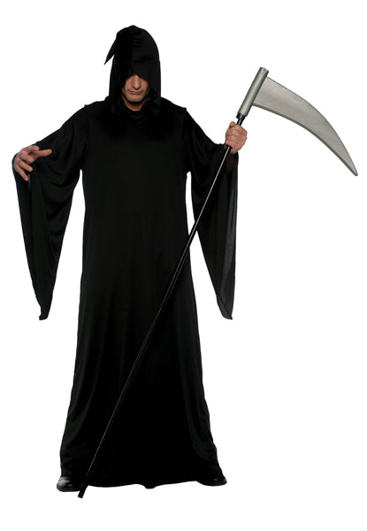 The perfect costume you need to haunt a home or attend a 50th Birthday party.... This terrific 3 piece costume includes a floor length black robe that has bell sleeves. Robe has hook and loop closures at the back of the neck for easy on and off. Costumes includes a hood that covers head and shoulders. Costume also includes a fabric belt for cinching it in at the waist. Pair it with Paradise face paint and a scythe sold separately. One size fits chest 42-46 inches, 2XL fits chest size 50-52