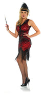 Look like the bee's knees when you wear this absolutely gorgeous 1920's flapper dress. This flapper has beading and sequins all over. Dress features a sheer black overdress with sequin and beads sewn on. The under dress is a rich scarlet. Costume has a side zipper for easy on and off. Dress has fun fringe on the hem line. This beauty is perfect for a Gatsby party, a flapper party and more.