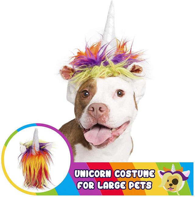 Is your fur baby as magical to you as a unicorn would be? Live the best of both worlds with this fun Unicorn hood. This soft plush hood has a sure fit adjustable design with elastic tie-down cord. White hood has a multicolor fur mane, white ears and a silver horn. Fits neck sizes 13"-32". Perfect for Halloween, renfairs, parties and photoshoots or just to show everybody how amazing your baby is.