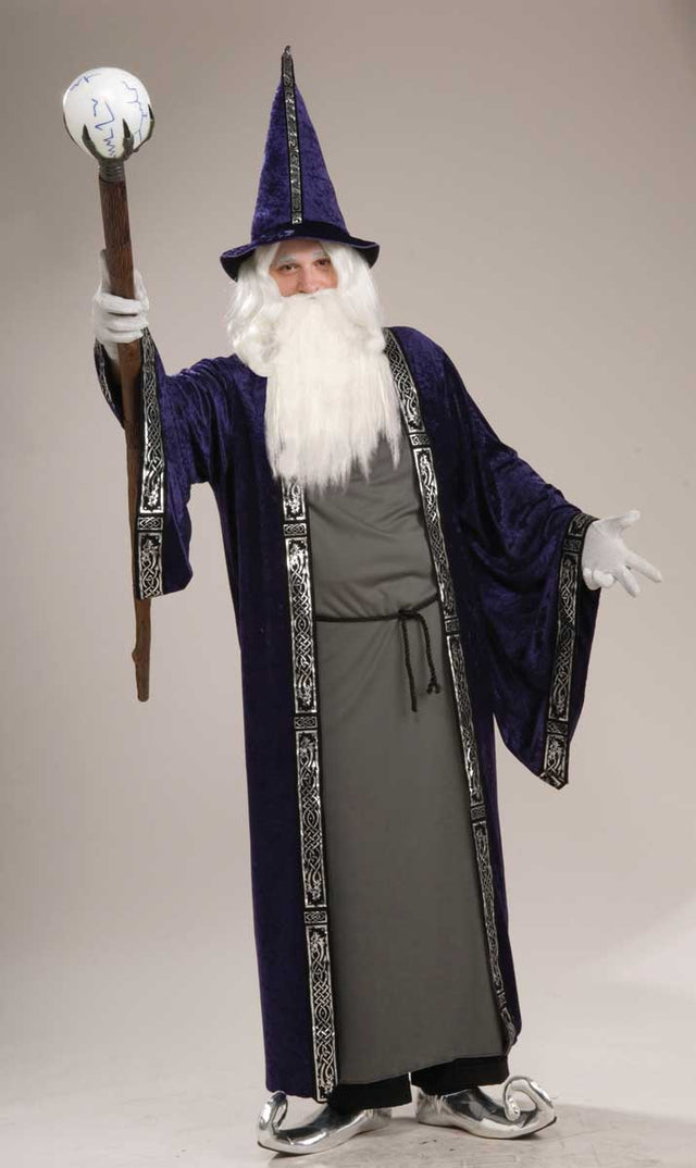 Consult the mystic powers, it's confirmed, you are a wizard! Now you just need a costume. You need this costume! This floor length costume includes a robe with attached coat. The robe is a dark grey with a velveteen coat with wide sleeves. Coat has Celtic dragon trim down the front and around the sleeves. Costume includes a traditional wizard hat. This is a plus size costume and will fit up to a 48 inch chest. Great for cosplay, costume or Halloween party. Pair it with a staff and wizard hair and beard, sold separately.