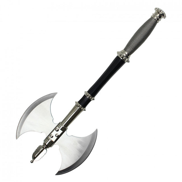 Charge into battle wielding this steel battle axe. This double bladed axe is made from steel with a lightly sharpened edge. Has a decorative steel top piece. Handle is wood and steel. Grip is metal wrapped in twisted steel wire. Includes display plaque so you can show off your favorite new weapon. Not for actual battle! Great for costumes or cosplays or let your favorite barbarian or warrior wear it peace tied to the RenFair.