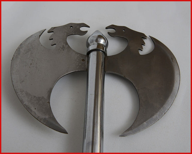 "Add a touch of fiery fierceness to your collection with our 26" Double Bladed Metal Dragon Axe! This unique display piece features two dragon-inspired blades with wings and a sleek black handle for a strong grip. Crafted from durable silver carbon steel, this axe is sure to make a bold statement."