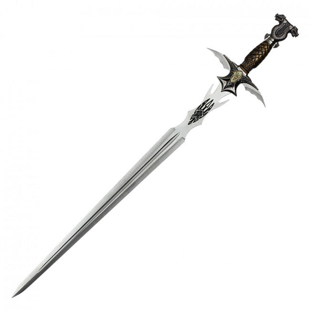 When you are trying to steal the dragon's hoard, you better have a great weapon! Wicked in its design, the sword has an exceptionally large ricasso, made up of spiked flares and wave-like curves, on which is centered a laser-etched symbol that dominates the upper part of the blade. The rest of the edge is angled perfectly down into an excellent stabbing point, and it is made all the lighter by the addition of a fuller down most of the blade. The guard is very-much reminiscent of a dragons back – scaled and with appendages stretching forth as wings. A scaled, contoured grip ensures not only a good hold on the weapon but also a continuation of the blades overall theme of dragon-kind and its evolution, while the pommel is a pair of dragons, linked at the neck, with a single blade set between them this blade comes free as a miniature sword. Decorative, deadly, and simply sublime, the Double Headed Metal Dragon Sword is an epic addition to any collection or armory.