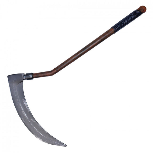 Can your Grim Reaper or Scarecrow costume really be complete without a scary scythe? Don't want to pack around a cheap plastic or metal one all night? You need this stunning Death Scythe. Made from heavy duty polyurethane foam, this prop weapon comes as two solid pieces. The scythe features a fiberglass rod core that gives this scythe some heft. Haft resembles worn wood. It has a ridged black grip which resembles wrapped leather. The scythe haft bends outward where it connects to the curved blade. At the bend, the haft screws together for assembly. The realistic blade looks like sharpened silver metal. Scythe is 39 inches long and the blade is 24 inches long and 3 3/4 inches at its widest point. Good for costumes, Haunted Houses and props.
