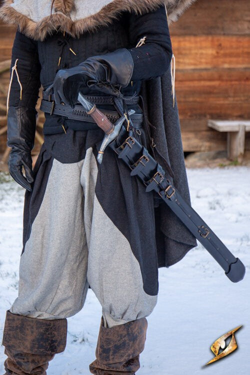 The Adjustable Scabbard is a leather scabbard that will fit most swords. The unique adjustable design of the sheath makes it an impressively versatile piece for your collection. You can adjust the length of the blade and width, to accommodate blades up to 2 3/4 inches in width. Furthermore, the scabbard has several straps, rings and a snap hook, making it possible to adjust the positioning, whether you prefer a snug fit on your hip or the scabbard hanging chivalric upon your leg. This scabbard is designed to be used by both right- and left-handed people. Scabbard is 38 1/2 inches in total length. Available in black or brown leather. One size fits most.