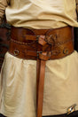 Broad Belt is a hefty leather belt fitted with D-rings for attaching additional equipment. The belt is made from two connected parallel leather pieces and adjustable braces at the front and back. The belt’s rim is stitched with a leather cord, adding rural detailing that gives life to your costume. Fasten the belt by securing its two 27 1/2 inch long belt tongues over a heavy leather plate on the front, locked in place by two square, brass belt buckles. Two spacers are included with each belt to give an extra option for customization and perfect fit. The spacers can be used alone or in combination. A 2 inch spacer already mounted and included in the shown measurements and a 8 inch spacer included in the packing. This Broad Belt is low-fantasy with a tough, but stylish look that can be used with a variety of characters and settings.
