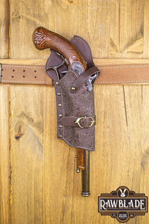 How do you become a famous pirate? Well Calico Jack knew. Mutiny the captain, steal his ship, runaway with your married girlfriend and live the pirate life. Jack Rackham was a short lived but infamous pirate who easily used a sword and pistol. Complete your Calico Jack look with this leather pistol holder. Choose from plain or decorated. These right handed holsters will help you juggle your fearsome pirate weapons. This gun holster is created to be very ergonomic and tactical. The Jack Rackham has a clamp for the hammer that holds and holds the gun even if its carrier comes out running. Likewise, the buckles it has allow to maintain a firm grip on any gun. This belt holster is valid for all types of belts up to 7cm. Available in brown.