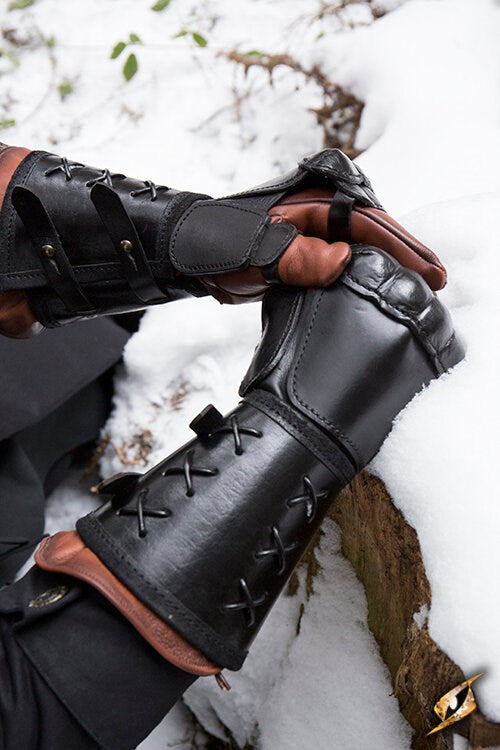 Save your fingers at your next LARP battle with these sturdy gauntlets. This Black Leather Gauntlet is a heavy-duty, vegetable-tanned full-grain leather gauntlet. These gorgeous gauntlets are made from two overlapping, oblong knuckle-shields and a thumb shield so the fingers are protected up to the first joint. These knuckle-shields are fitted onto a larger plate to protect the back of the hand, which sits over a large cuff covering the wrist and lower-arm. All elements are stitched around the edges to add structure and prevent deformation. In addition, the knuckle and thumb shields are convexly shaped to add extra stiffness to the leather. Secure this gauntlet to your hand by sliding it through the leather straps attached to the knuckle and thumb shields. The cuff is decorated with flattened leather cords and is adjustable with a system of leather straps and brass knobs. These gauntlets are a Medium/Large size. Available in black leather and left or right hand. Wear one or two to enhance your outfit and protect your weapon hand.