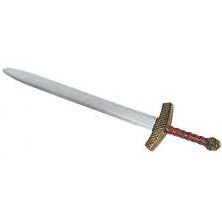 Protect the king and the castle with this sturdy molded plastic sword. When your knight needs a weapon, reach for this one. This lightweight sword is 33 inches in length and features a silver blade, gold cross guard and red, faux leather handle and gold pommel. Light enough to carry all day at the renaissance fair, pirate festival or at the costume party. Wear it with your knight, Viking, barbarian or pirate costume.