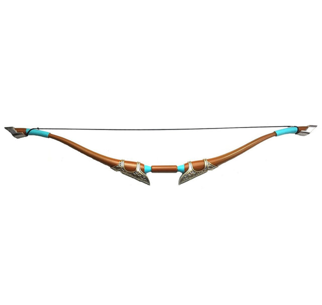Join a heroic fellowship or stalk the elven woods of your homeland with this magnificent bow. This lightweight foam bow is the perfect accessory for your LARP character or renaissance fair. This bow is a generous 36 inches in length. Bow has decorative, carved, raised areas around the hand hold. Bow string is made from stretch elastic cord. Foam bow is painted a rich brown with turquoise blue details. Hand hold guards are silver painted with gold carved details. This is the perfect accessory for an elven LARP or Halloween costume. Also good for a ranger, woodsman or noble. Can fire foam tipped arrows.