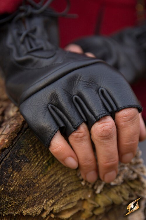 When you are the parties thief, you need nimble fingers. That means you need your fingertips free to feel for traps, catches and locks. But you still need to protect your hands for future thieving. Black Thief Gloves are fingerless leather gloves with short cuffs. They are made from black dyed leather and stitched at all joints around the fingers, wrists and edges. This stitching improves the strength of the material by preventing it from deforming with heavy use or from exposure to the environment. The fit of the gloves can be adjusted with leather lacing up the cuff.
