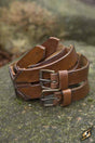 The two braces are fitted with brass D-rings for attaching or suspending bags and other equipment. Usable by a large variety of shapes and sizes due to its long 40 cm belt-tongues and nine punched holes, this belt is a perfect solution for anyone’s kit. With its simple style and rings, the belt is both functional and stylish, and can be used by lords or peasants--no matter race or culture.