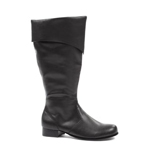 The perfect pirate boot? Maybe! The Bernard boot is a rich black faux leather knee high boot. Boot has a 1 inch heel. The Bernard has a 4 3/4 inch cuff on the top. Boot zips up the inside so they are easy to take on and off. Boots are not available in half sizes. These are regular sized boots and not for wide feet. Excellent for pirates, military, calvary and more. Made from a quality black faux leather. Medium fits shoe size 10-11, Large fits shoe size 12-13