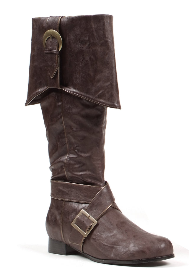 Avast, ye scurvy dog, don't ruin a great pirate costume with a lame pair of tennis shoes! You need a terrific pair of knee high boots. These awesome boots feature a man made upper with straps and buckles across the arch. Boots have a bell top with a strap and buckle detail. Boots have a sturdy zipper on the inside of the leg for easy on and off. Boot has a 1 inch heel and is made from man made materials. Ankle circumference is 10 inches and mid calf is 18-19 inches. Large fits boots size 12-13 regular.