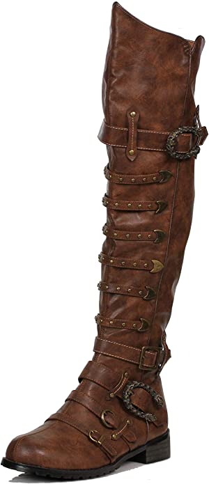 When you stalk across the deck of your ship, you should have footwear that matches your swashbuckling style. The boots have a zipper down the insole, which make them much easier to put on. There are multiple straps running horizontally across the front. Many of the straps have brass-colored studs. They match a buckle on the top strap near the cuff of the boot. There are additional buckles on the boot below the ankle. These boots look great with a variety of pirates, knights, warriors and more. Available in Men's small (8-9) or Medium (10-11). Available in a brown PU leather.