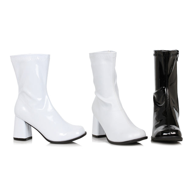 Not all boots are knee or thigh high. Some of the coolest boots are ankle high. Like these white or black beauties. These sassy boots look like white or black patent leather. Boots end slightly above the ankle and feature a 3 inch platform heel. Boots have a sturdy matching zipper on the inside of each boot. Perfect for a 1960's or 1970's mod look or rock star look. Good boot for a gogo dancer. Boots are standard size only. No half sizes. Order next size up.