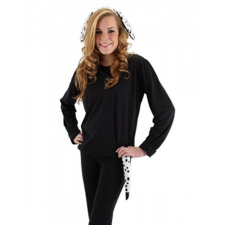 Are you just a puppy in search of your Cruella?  Or maybe a Dalmatian searching for your firetruck?  Well your adorable puppy costume needs a great set of  ears and a cute tail.  This dalmatian ear and tail set is made from white fleece with black spots.  Ears are attached to a fleece covered headband.  The white and black spotted tail has a loop on one end so that you can slide it onto a belt or safety pin it in place.  Tail has a black tip.  One size fits most adults and teens.  Makes for a easy group costume (with some of your 100 brothers and sisters).  Pair it with a Cruella or fireman's outfit for a terrific couples costume.