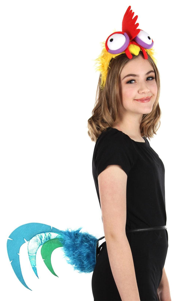 It can't really be an epic adventure without some comic relief. In Moana, she had her silly rooster Hei Hei! With his crazy eyes, wild clucks and bright colors, he is a fan favorite. Now you can dress up and act like Hei Hei. This terrific set comes with a headband with big, comb, wattle and beak. The headband itself is covered in soft yellow faux fur. Set also includes his bright blue tail and three long tail "feathers" made from green, blue and iridescent fabrics. This is a great quick costume with no muss or fuss. One size fits most. Officially Licensed.